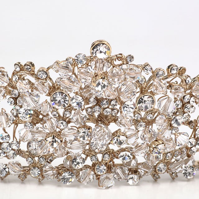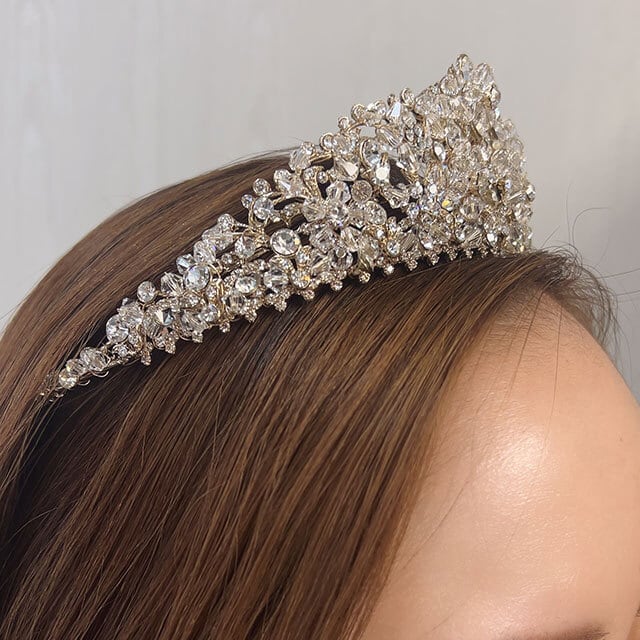 花嫁が夢にまで見た輝きを形にした、最高級クリスタルを贅沢に使用したウェディングティアラです。眩い光の粒をまとうかのように、どの角度から見ても息をのむほどまばゆい輝きを放ち、その存在感はまさに別格。
