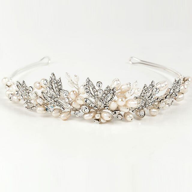 天然淡水パールとリーフ型のビジューが美しく組み合わされた、優雅でありながらも上品な印象を与えるティアラです。温かみのある天然淡水パールの輝きと、クリスタルのきらめきが、花嫁様の美しさを最高潮に引き立てます。