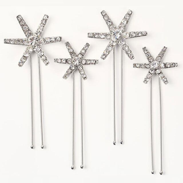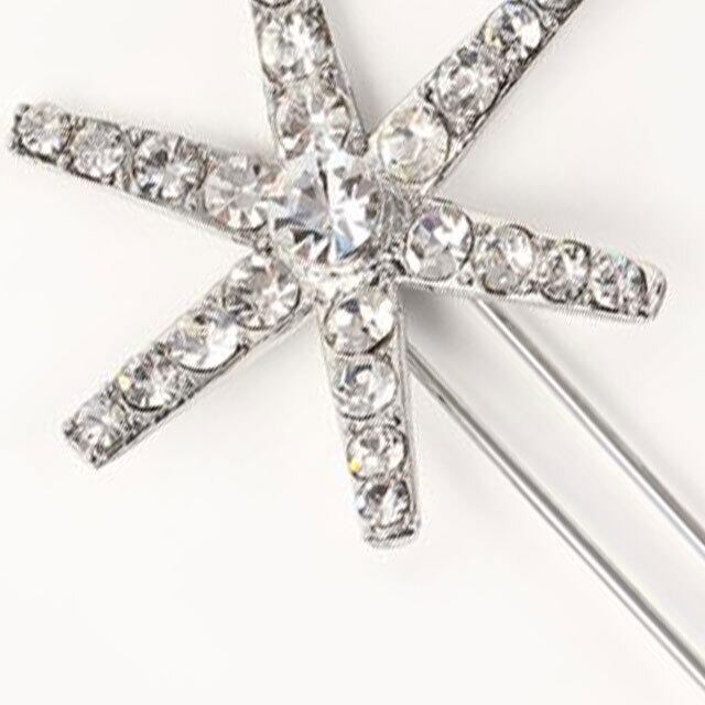 美しさを引き立てる特別なブライダルアクセサリー、【ヘッドアクセサリー】T3213-1(SV)の登場です!星形のクリスタルビジューが輝くこのヘッドアクセサリーは、大小4本セットのUピン仕様になっており、いろいろな髪形に合わせる事ができます。特別な日の装いにぴったりの華やかな輝きが、あなたの美しさを一層際立たせ、心に残る瞬間を演出します。