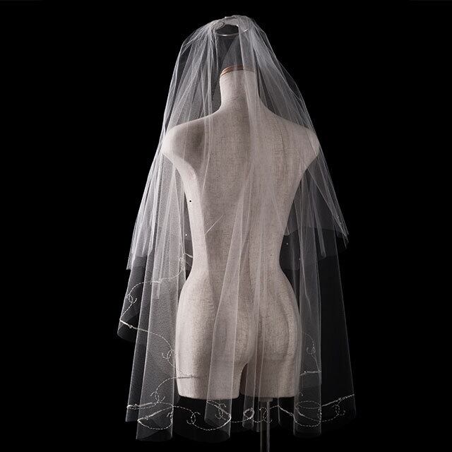日本規格に基づき、海外の提携工房で熟練の職人が一つひとつ丁寧に仕上げた、インポートのウエディングベールです。ベールの縁を美しく縁取るスカラップデザインに、繊細なビーズとクリスタルによるシンプルな刺繍が施されており、上品で洗練された印象を与えます。軽やかなメロウ加工で縁取られた透明感あふれる柔らかな日本製チュールが、花嫁様の清楚な魅力を引き立て、特別な日の装いを美しく演出します。
